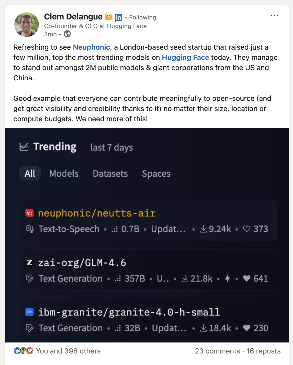 Last week at Neuphonic we released NeuTTS Air, a small LLM-based TTS model aimed at people who’re interested in deploying smaller TTS models on-device. The response has been fantastic - we’ve amassed just over ~50k huggingface downloads and ~2.5k github stars over the past week. As I’m writing this we’re trending #1 on all huggingface models! Not bad for a 5-person pre-seed company :)